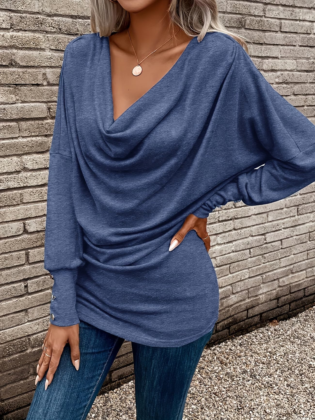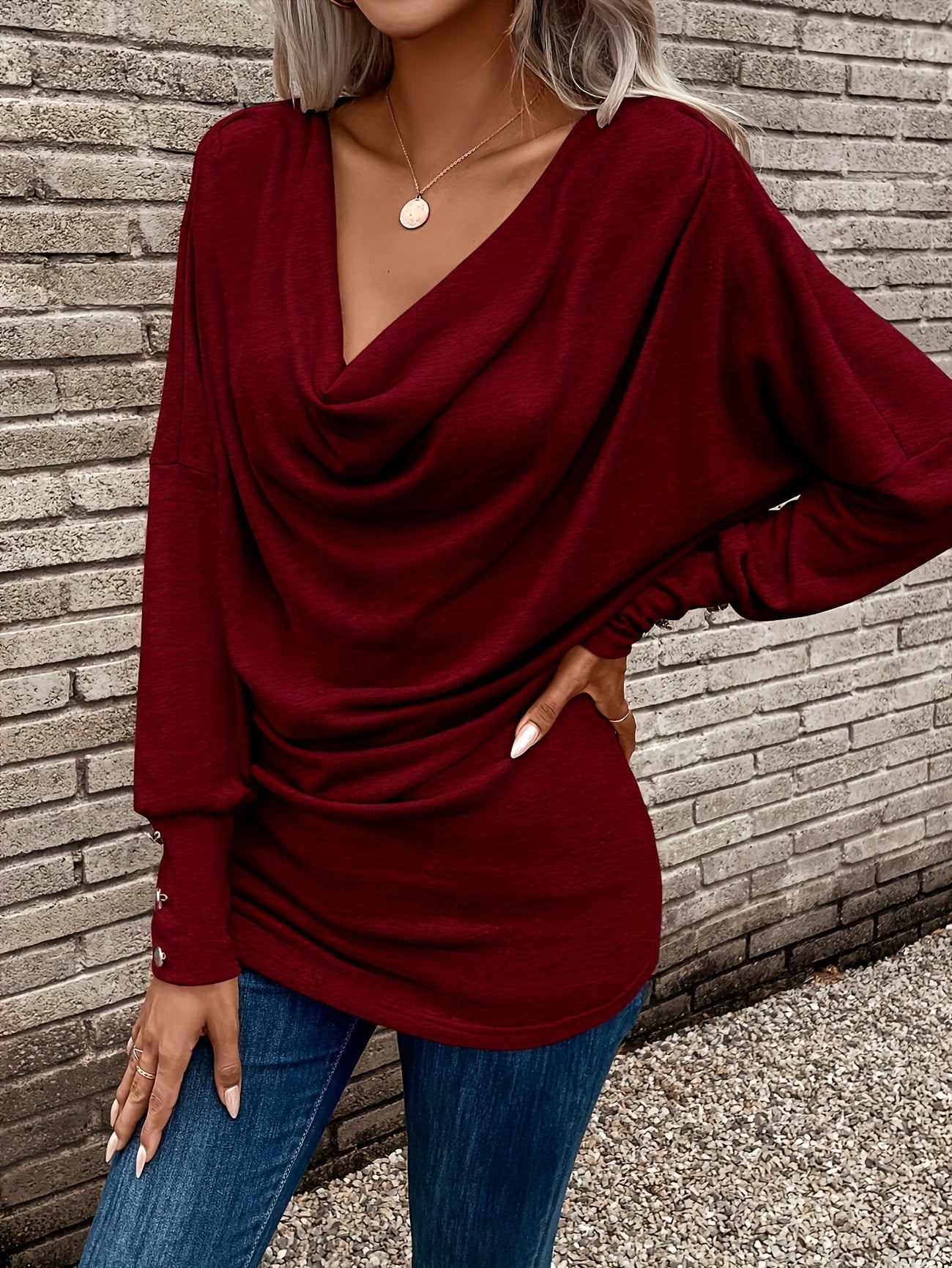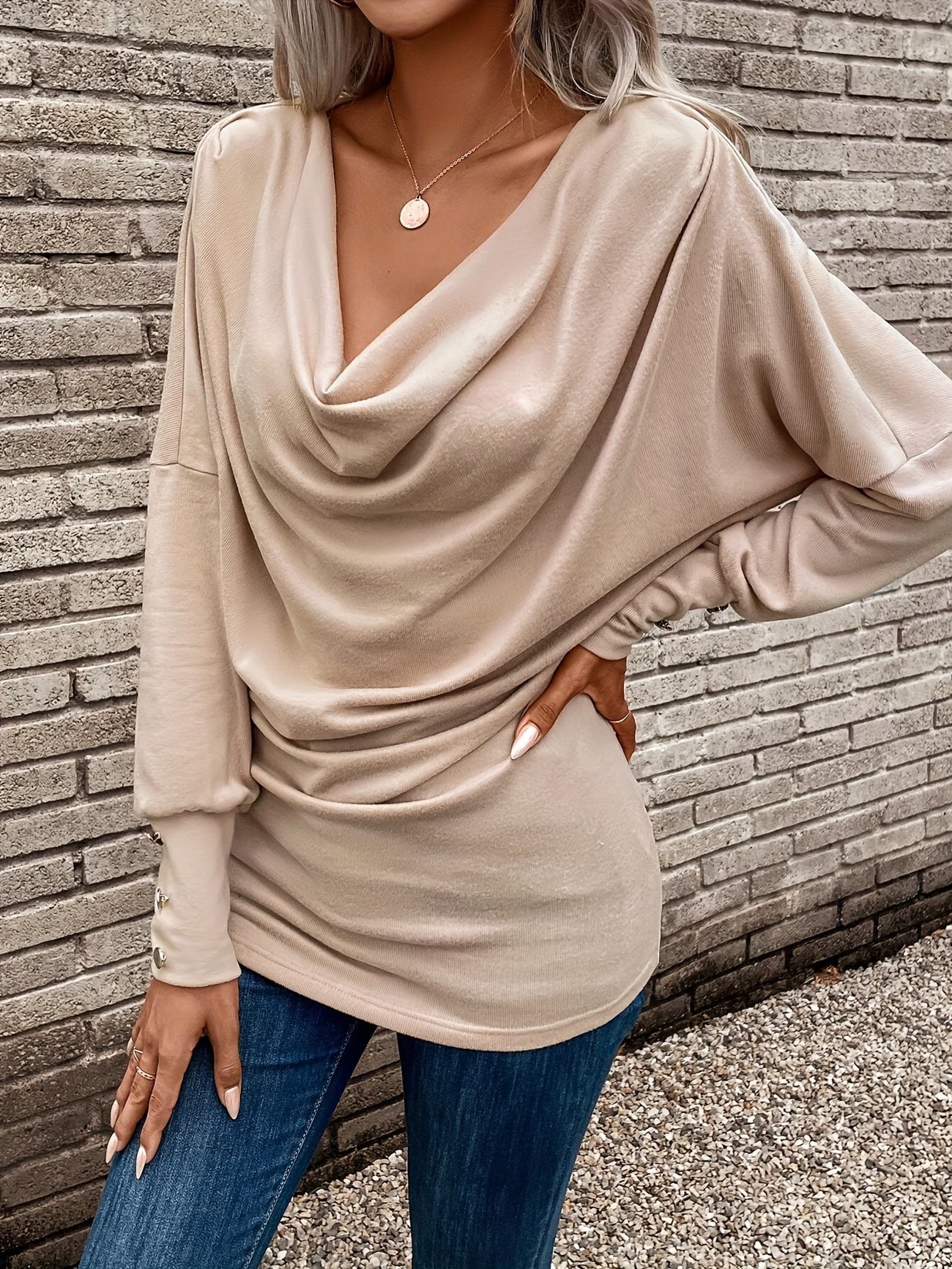 - Jellegzetes vízesésnyak: Itt a nyakkivágás a főszereplő. Lágy, nagyvonalú redőzése gyönyörűen keretezi az arcot, és melegséget ad anélkül, hogy szorítana, mint egy szűk garbó.